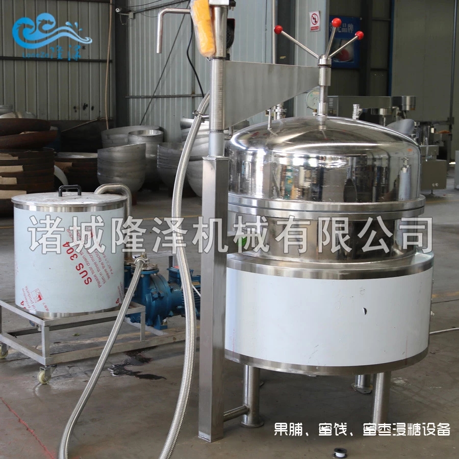 真空浸糖鍋采用了先進的真空抽負壓(yā)原理:在真(zhēn)空條件下果(guǒ)脯內微孔及植物(wù)細胞間的空氣和部分水分先被抽吸排出,然後高濃度浸漬(zì)液在真空濃度差及重力作用(yòng)下滲入植物細胞間隙,從而極大的提高浸漬效(xiào)率。