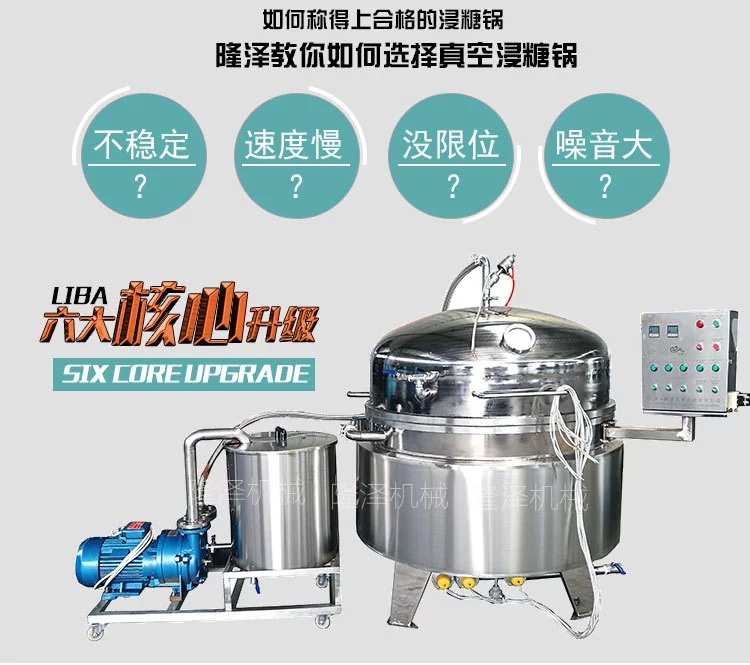 6、真空浸糖鍋的出現,不管在時間還是在效率上都解決了很多的問題。真空浸糖鍋以一定(dìng)壓力(lì)的(de)蒸汽為熱源,真空浸(jìn)糖鍋具有受熱麵積大、熱效率、加熱均勻、沸騰時間短、加熱溫度容(róng)易控製、方便清洗、真空度高等特(tè)點。設備采用304、316L不鏽鋼材料製造(符合國家衛生級標準)。