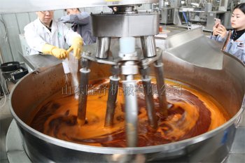 辣椒醬炒鍋 炒製醬料不糊(hú)鍋 炒辣椒醬機器刮底攪拌 辣椒醬在炒製的時候特別容易糊(hú),所以在加工的時候攪拌是非常重要的,我們的多(duō)爪炒鍋(guō)係列的設備是專門用於各種醬類,辣椒炒製...