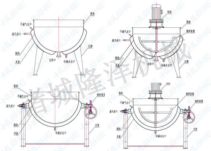 6、可傾式和攪拌式夾(jiá)層鍋,每班使用前,應在各轉(zhuǎn)動部位(wèi)加油;攪拌式夾層鍋鍋體麵上的部件,建議采用(yòng)熟菜油;其它各處均采用30#--40#機械油。