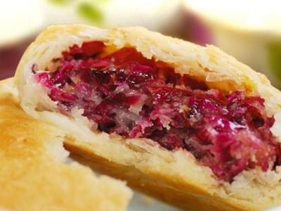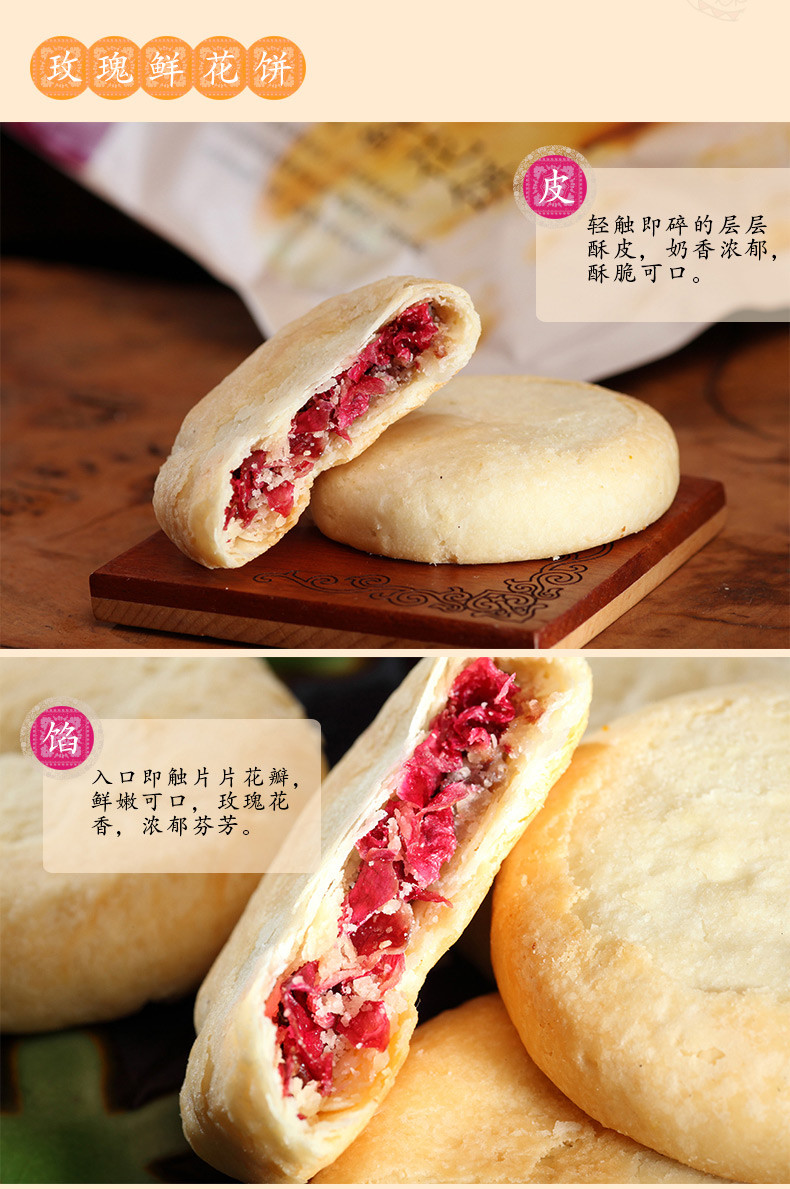 1、配料:優質麵粉、白砂糖、水(shuǐ)、食用植物酥油、玫瑰花餡(xiàn)(新(xīn)鮮玫瑰花、蜂蜜(mì)、熟粉(fěn))。