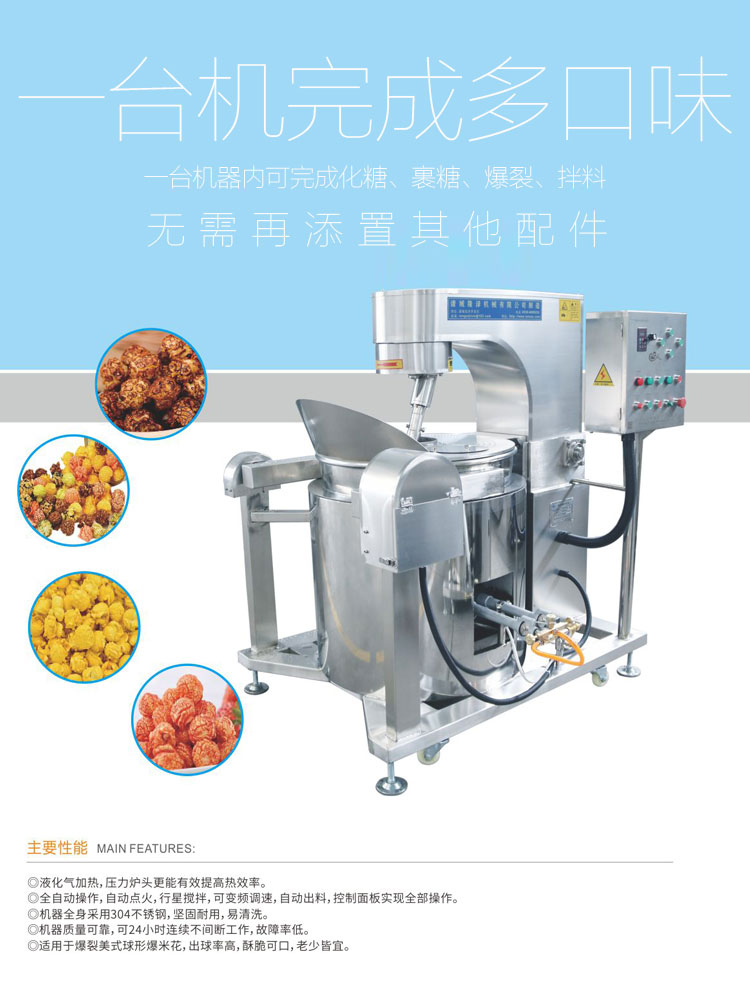 我公司獨立研發的(de)一 款(kuǎn)炒(chǎo)製(zhì)球形爆米花專用設備,具有節能,衛生,出球效(xiào)率高,操(cāo)作簡單,全智能全自動一鍵式操作。節能環保,無廢氣廢渣和噪音汙(wū)染。加(jiā)熱(rè)迅速,瞬間溫度可達280度,使玉米瞬間爆裂。使用安全,節省人力。從原材料到設備到加工技術,我們為您提供全方位一站式服務。