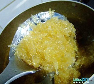 6. 待柚子皮煮到半透明就可以放入柚(yòu)子(zǐ)瓤了。