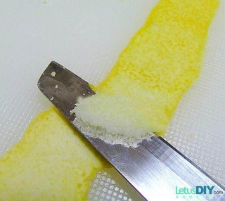 2. 將柚子皮剝開刮去裏麵的白瓤,好用刀子慢慢的刮,越(yuè)薄越好。這樣做是為了減輕苦味。