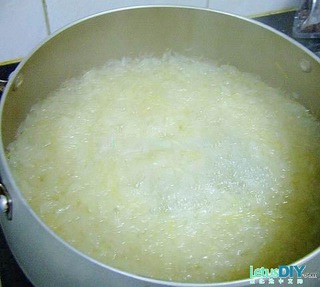 8. 約半小時後,柚子茶的顏色就會由(yóu)白(bái)色變為黃色,這都是冰糖的(de)作用啊(ā)~~
