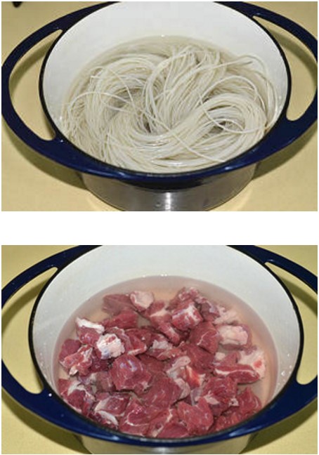 米粉一包,牛裏脊肉一(yī)小塊,胡蘿(luó)卜,蔥,薑,香菜